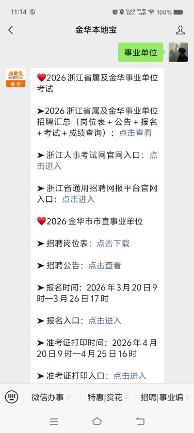 温馨提示:扫描上方二维码关注【金华本地宝】公众号,关注后在对话框回复【事业单位】即可获取2026浙江省属事业单位及金华事业单位招聘岗位表、招聘公告、报名时间及入口、准考证打印时间及入口、考试时间等更多信息。
